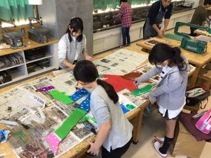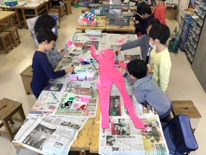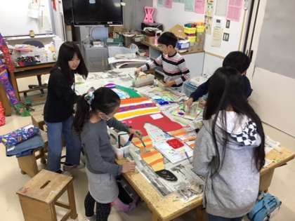 展覧会に向けた共同制作の様子です。協力しながら作業を進めています。
