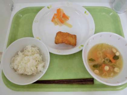 献立 ご飯、いかの竜田揚げ、大根の浅漬け、吉野汁、牛乳