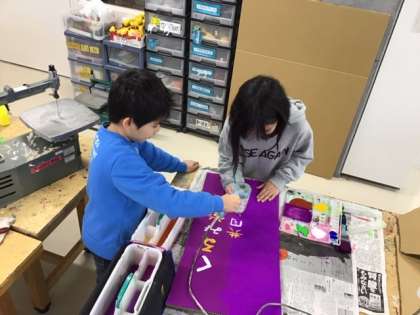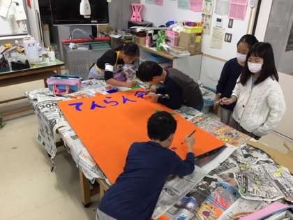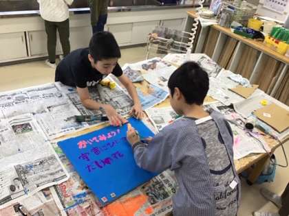 展覧会の案内板を作成しています。みんなで展覧会を盛り上げています。