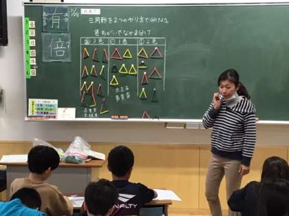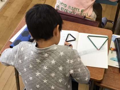 算数の時間です。3色のストローを使って、三角形を仲間分けをしています。