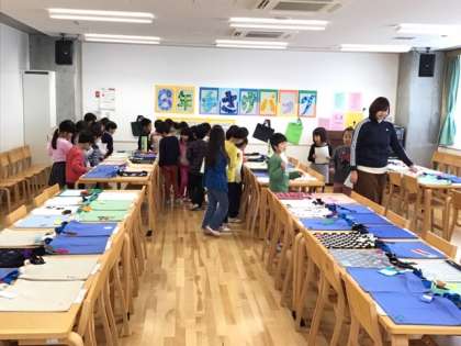 2年生の鑑賞時間です。家庭科の作品を鑑賞しています。