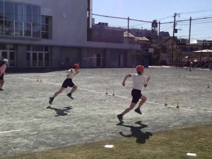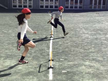 体育の時間です。ミニハードルを使って、障害走の練習をしています。
