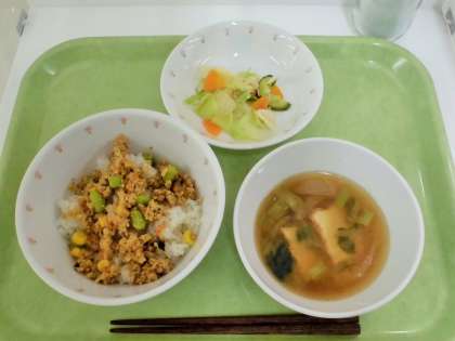 献立 めだいそぼろご飯、塩だれキャベツのサラダ、小松菜と生揚げのみそ汁、牛乳