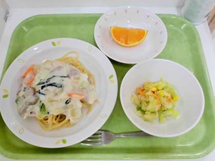 献立 小松菜のクリームスパゲッティ、コーン入りフレンチサラダ、ゆめオレンジ、牛乳