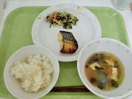 献立 ご飯、さばのみそこうじ焼き、ほうれん草とじゃこの和え物、みぞれ汁、牛乳
