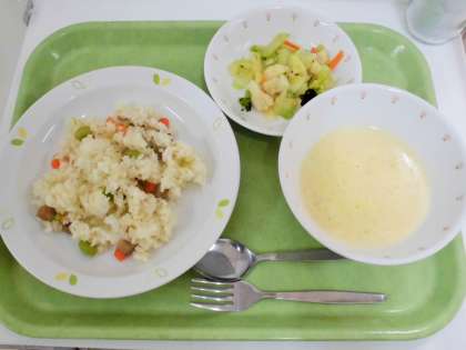 献立 ハムピラフ、コーンポタージュ、花野菜サラダ、牛乳