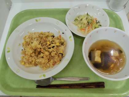 献立 ビビンバチャーハン、はりはりサラダ、わかめスープ、牛乳