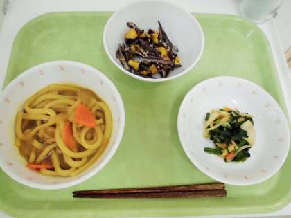 献立 カレーうどん、ほうれん草のお浸し、変わり田作り、牛乳