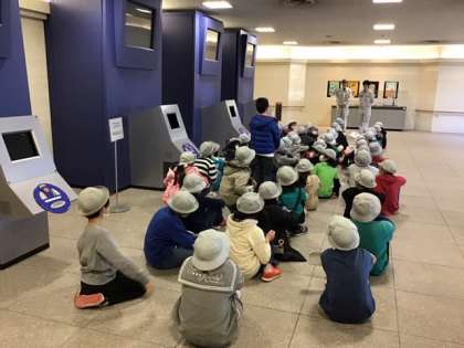 清掃工場に到着しました。はじめに係の方からゴミの種類などについて説明を受けています。