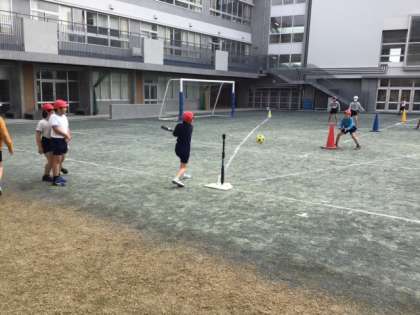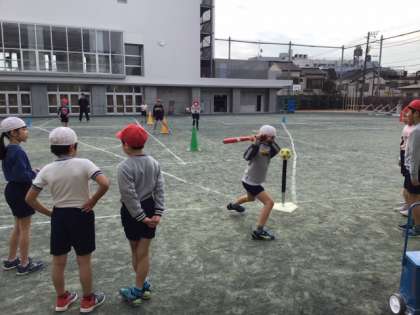 体育の時間です。Tボールに挑戦しています。