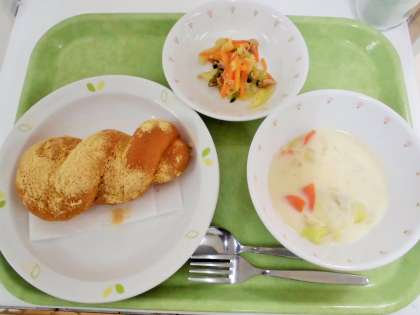 献立 きなこ揚げパン、白菜のクリーム煮、にんじんサラダ、牛乳