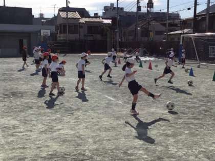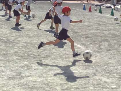 体育の時間です。ボールけりあそびに取り組んでいます。ねらったところに蹴ることができるでしょうか?