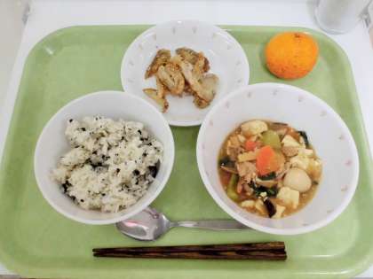 献立 わかめご飯、豆腐とうずら卵の五目煮、ごぼうの甘辛揚げ、ぽんかん、牛乳