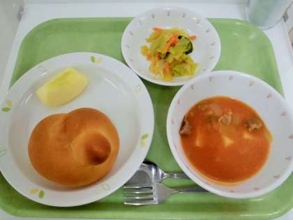 献立 ミルクパン、トマトシチュー、キャロットソースサラダ、りんご、牛乳