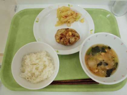 献立 ご飯、れんこんのつくね焼き、キャベツのお浸し、冬野菜のみそ汁、牛乳