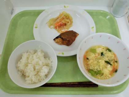 献立 ご飯、さばのごまみそかけ、こんにゃくサラダ、かきたまスープ、牛乳