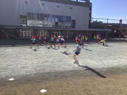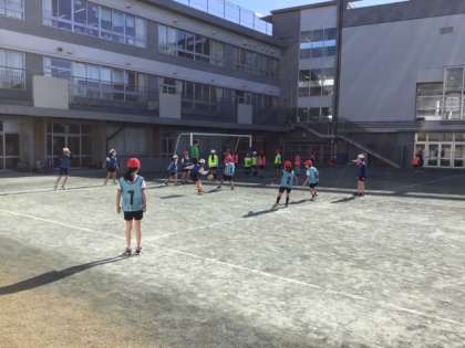 体育の時間です。元気にラインサッカーに取り組んでいます。