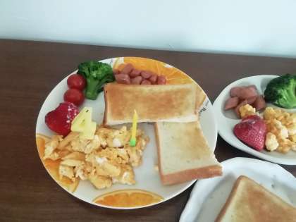 朝食のプレートにロウソクを付けるなんて、とても自由ですてきなアイデアだと思いました。