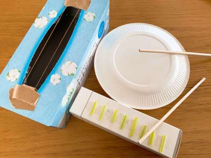 3つの楽器を作りました。ギロは、わりばしじゃなくて、ストローやストローのぎざぎざでこすると、音がかわります。