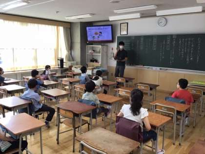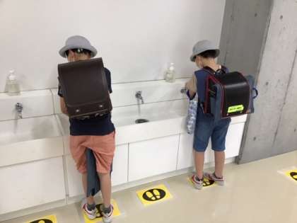 今日は、3、4年生の分散登校日です。手をしっかり洗い、1時間目は感染症予防のための学習をしています。