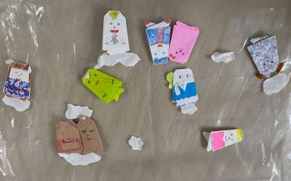 オバケに顔をかいたり、服をはったりするのが夢中になって楽しかった。いろんな種類のオバケをかいて、顔もぜんぜんちがうようにしたり、名前をつけるのもおもしろかった。