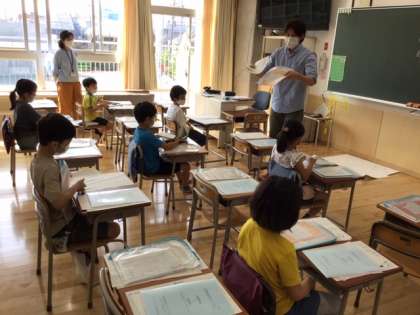 今日は、低学年の分散登校日です。1年生のみなさんも元気に登校し、教室ではしっかり先生のお話を聞いています。2年生はすっかり成長し、落ち着いたスタートです。