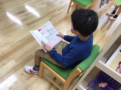 学校図書館での読書の時間です。たくさんの本に触れてほしいと思います。