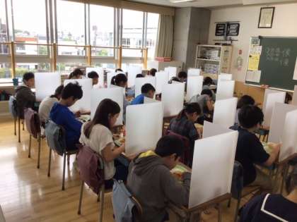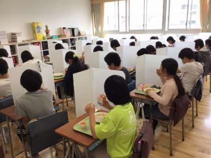 給食の時間は、一人一人の机の上にパーテーションを立てます。