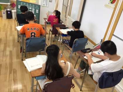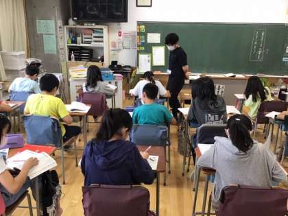 国語の時間です。「見立てる」という文章の要旨を150字でまとめる学習に取り組んでいます。