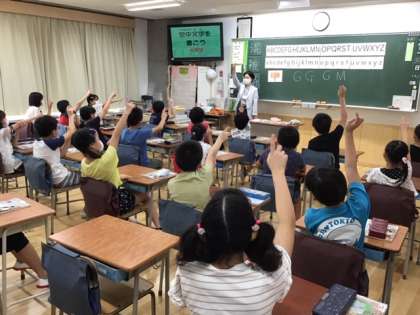 外国語の時間です。空中に文字を書いて、アルファベットの練習をしています。