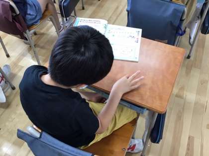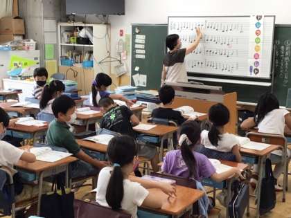 音楽の時間です。楽譜を見ながら、鍵盤の運指の練習をしています。