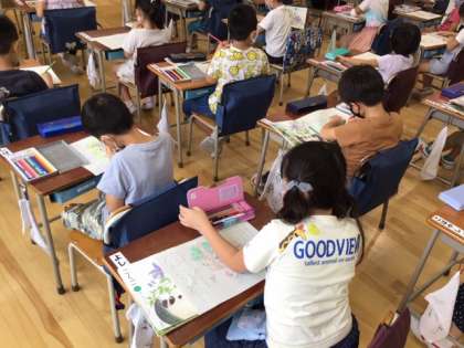 国語の時間です。絵を見ながら、「何が」「どうした」、「だれが」「どうした」の文を作っています。