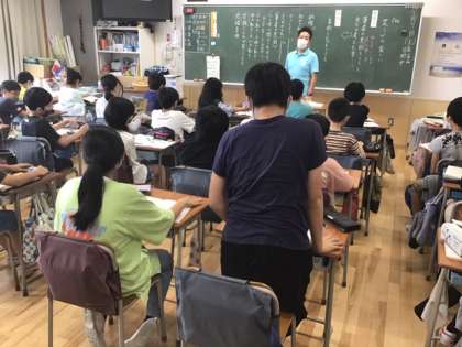 国語の時間です。「笑うから 楽しい」の文を事例に気をつけながら読み、作者の意図を考え、自分の言葉でまとめます。