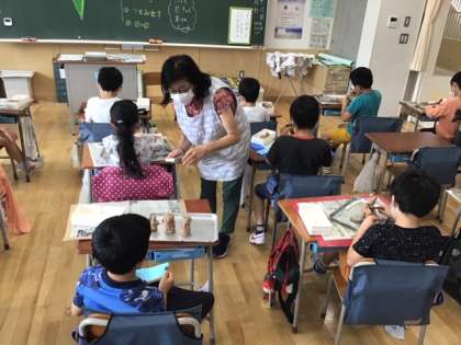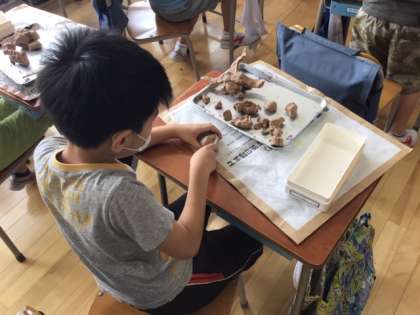 図工の時間です。「ひみつの グアナゴ」という題材です。粘土で思い思いの生き物を作っています