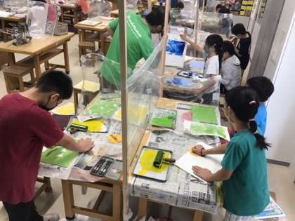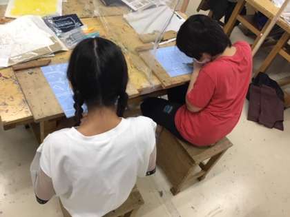 図工の時間です。版画に挑戦しています。色を重ねて、作品に広がりを出していきます。