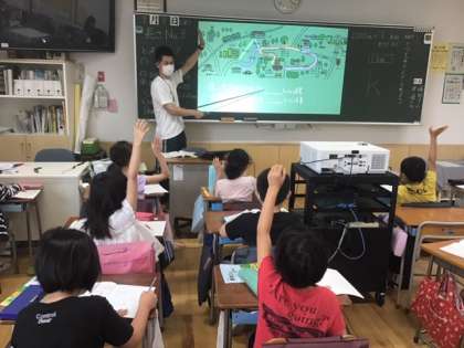 算数の時間です。大きな地図を使って、長さの学習をしています。