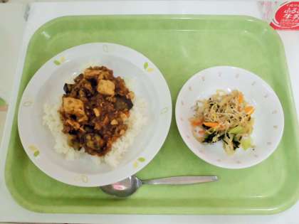 献立 豆腐となすの麻婆丼、かみかみサラダ、牛乳