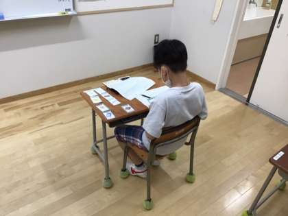 算数の時間です。買い物カードを使って、自分で問題を作る学習に取り組んでいます。