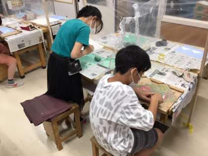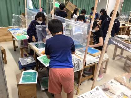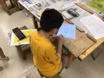図工の時間です。「彫り進め版画」に取り組んでいます。彫って、刷ってを3回繰り返して仕上げます。