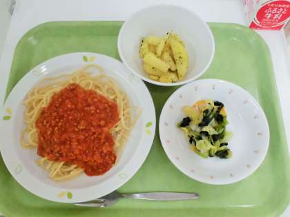 献立 ミートソーススパゲッティ、小松菜サラダ、青のりポテト、牛乳