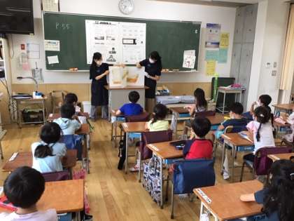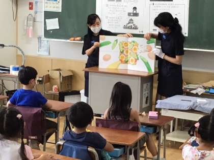 国語の時間です。司書の先生が読み聞かせをしてくれています。サンドイッチが食べたくなっちゃいましたね。