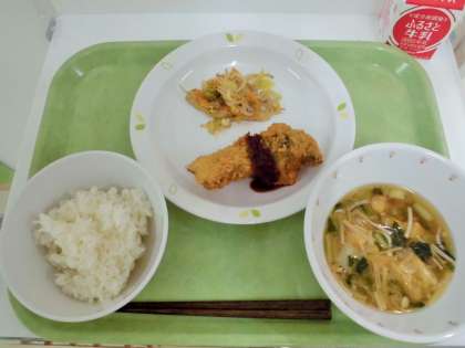 献立 ご飯、白身魚のフライ、野菜のピリ辛和え、えのきのみそ汁、牛乳