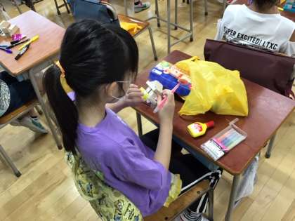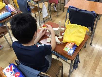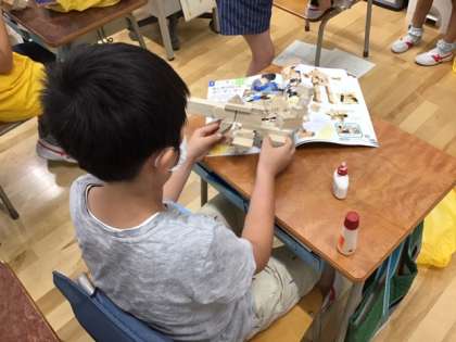 図工の時間です。のこぎりでザクザク切った木を組み合わせて、自分らしい作品を作っています。