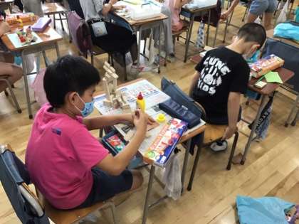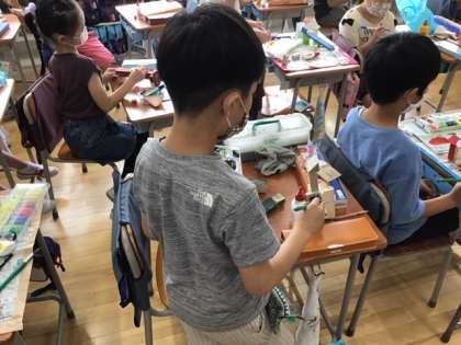 図工の時間です。「のこぎりひいて ザクザクザク」初めてのこぎりを使って作品を作りました。完成間近ですね。