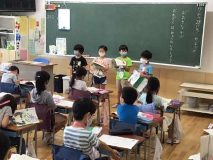 国語の時間です。「おおきな かぶ」の音読発表会をしています。「うんとこしょ どっこいしょ」