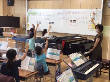 音楽の時間です。鍵盤ハーモニカの指づかいの練習をしています。