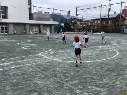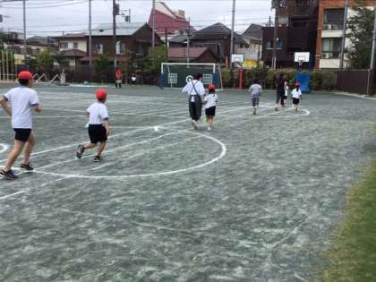 校庭で体育の時間です。持久走のあと、しっぽ取り鬼をしました。たくさん体を動かしましたね。