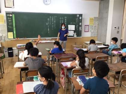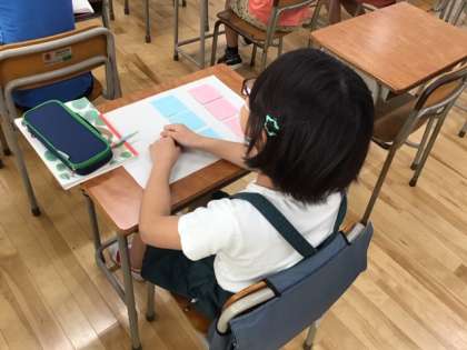 今日は、「読書感想文の書き方」について学習しています。2色のふせんを使って、メモをもとに書いていきます。