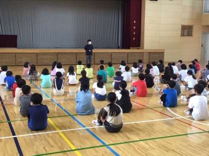 2学期スタートの集会をしています。高学年らしい立派な態度です。