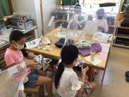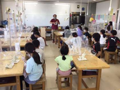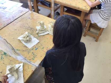 図工の時間です。ノリノリで楽器を演奏する生き物を作りました。